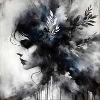 Dit intrigerende schilderij, gedrenkt in serene blauwtinten, onthult de gracieuze vorm van een vrouw met bloemen in haar haar. De levendige nuances symboliseren groei en vernieuwing, terwijl de organische verstrengeling harmonie tussen mens en natuur uitdrukt. Kracht en kwetsbaarheid stralen van de vrouwelijke figuur, en de subtiele…