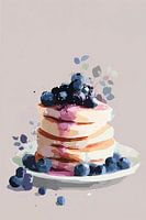 Een digitale illustratie van een heerlijke stapel luchtige pancakes, rijkelijk gegarneerd met verse bosbessen en een subtiele roze siroop. De zachte, pastelachtige kleurtonen en losse penseelstreken creëren een dromerige, moderne uitstraling die de warmte en comfort van een perfect ontbijt uitstraalt.