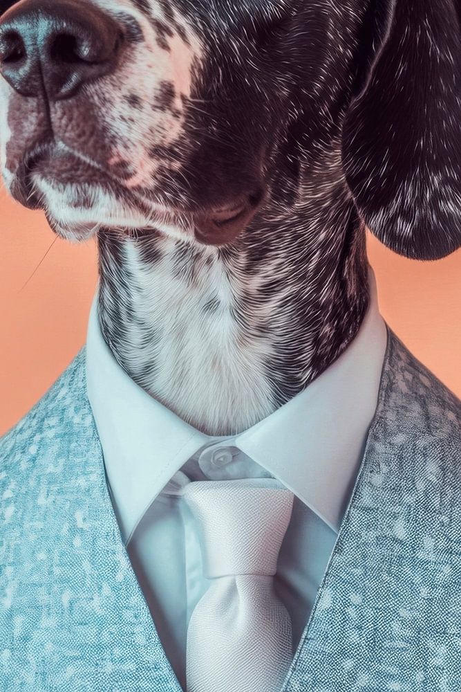 Een majestueuze Bluetick Coonhound schittert in een schitterend pak en stropdas, alsof hij de ster is van een elegant gala. Zijn opvallende, gevlekte oren en diepe, expressieve ogen geven hem een uitstraling van waardigheid en charme. Met een blik vol gratie lijkt hij klaar om elk moment te veroveren.