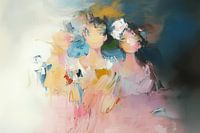 Een abstracte en levendige compositie die het gevoel van beweging en energie vastlegt. De vrouwenfiguren, gehuld in pasteltinten en organische penseelstreken, vervagen in de omgeving, wat een dromerige sfeer creëert. Het kunstwerk straalt een gevoel van vreugde en vrijheid uit, terwijl het mysterie van hun verborgen gezichten de kijker uitnodigt om zelf de emoties en verhalen van de figuren in te vullen.