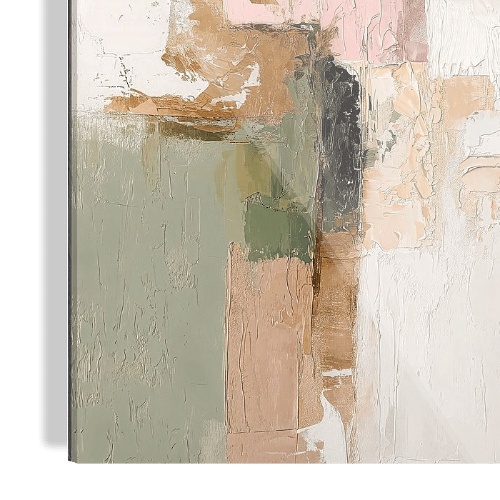 Een rustgevend abstract kunstwerk waarin zachte rozetinten harmonieus samenvloeien met subtiele groene en beige accenten. De textuurrijke verfstreken creëren een organische compositie met een kalme, bijna meditatieve uitstraling. De verschillende kleurvlakken zijn op een verfijnde manier met elkaar verbonden, wat resulteert in een…