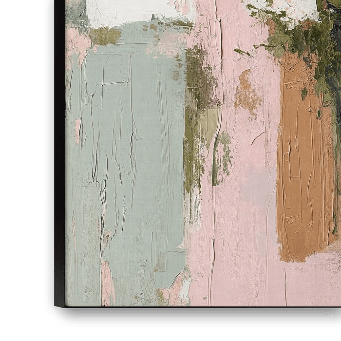 Een abstract kunstwerk waarin zachte pasteltinten harmonieus samenvloeien met aardse groentinten. De compositie toont expressieve penseelstreken en textuurrijke vlakken die een rustgevende balans creëren tussen organische en geometrische vormen. Subtiele roze en mintgroene accenten worden versterkt door krachtige donkere elementen, wat resulteert in een moderne en tegelijk tijdloze uitstraling.