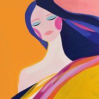Minimalistische, naief en modern abstract portret van een jonge vrouw met blauw haar op een okergele en roze achtergrond. Ze draagt een jurk in banen die complementerend zijn aan het schilderij in de kleuren geel, rood, roze, wit en blauw. Haar ogen zijn gesloten, met mooie overpeinzingen. Roze blossen op haar wangen en een spectrum aan mooie kleuren. Passend bij diverse stijlen en trends, zoals modern abstract, kleurrijk, portret vrouw. Artist: Bianca ter Riet.