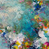 Dit kleurrijke schilderijtje is in originele uitvoering slechts 20x20cm groot. Maar door het vastleggen van dit werk met de camera kun je alle smeuïge penseelstreken, lagen, lijnen en in elkaar opgaande kleuren prachtig gedetailleerd zien. Je kruipt echt in het beeld. Zoom maar eens in voor een indruk!