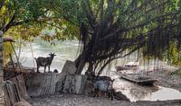 Bij een riviertje in Vietnam treffen we geiten en boten.