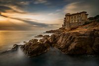 Boccale Castle on rocky coastline near Livorno at sunset, Italy