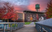 Oude industriecultuur in het Ruhrgebied, voormalige staalfabrieken in het huidige Westpark in Bochum bij zonsondergang, Noordrijn-Westfalen, Duitsland