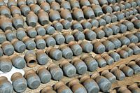Bodem van pottenBhaktapur, Nepal: Pottenbakkersplein. Symmetrische rijen van traditionele potten