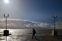 De Bodensee tegen het licht aan de promenade van Friedrichshafen.