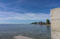 Het Bodenmeer, met een muur op de voorgrond, veel blauw en water.