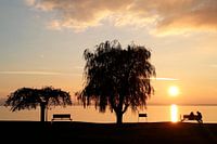 Het Bodenmeer wordt omringd door drie landen: Duitsland, Oostenrijk en Zwitserland. De mooiste zijn echter de promenades en de stranden in Duitsland, simpelweg vanwege de geografische ligging van het meer in zuidwestelijke richting. Betekent een weelderig uitzicht op de Zwitserse bergen en kleurrijke zonsondergangen. Op deze foto echter, enigszins verborgen onder vochtige zomerwolken, de Zwitserse kust en de bergen daarachter.