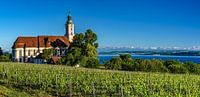 Het historische klooster van Birnau aan het Bodenmeer met uitzicht op het meer en de Zwitserse Alpen op de achtergrond.