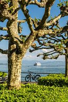 Duitsland Bodensee Friedrichshafen promenade met vliegtuig boom fiets en veerboot en Zwitserse alpen