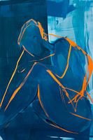 Gehuld in krachtige blauwe tinten spreekt het silhouet van gratie en melancholie. Felle oranje accenten doorbreken de koele stilte en geven het beeld een emotionele diepte. De gebogen lijnen suggereren een peinzende houding, alsof het lichaam is ondergedompeld in een innerlijke wereld vol gedachten en gevoelens.