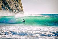 Deze bodyboarder neemt een mooie golf op het prachtige strand Beliche te Portugal.