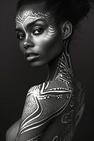 Een topless vrouw die beschilderd is, zwart/wit. Digitale kunst.