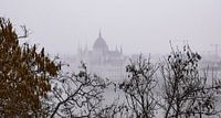 Het ontzagwekkende Hongaarse parlementsgebouw torent uit boven de bomen op de oevers van de Donau in Boedapest tijdens een winterse sneeuwbui.