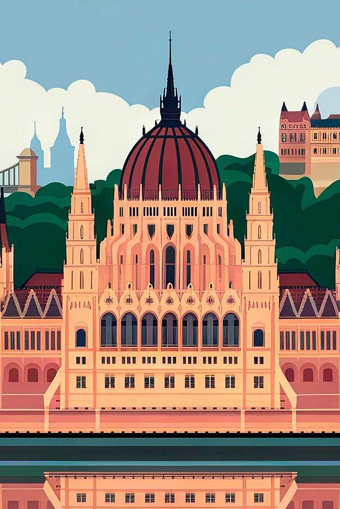 De prachtige architectuur van Boedapest wordt majestueus weerspiegeld in het kalme water, terwijl het indrukwekkende parlementsgebouw met zijn delicate torens en opvallende siervormen de aandacht trekt. Omgeven door glooiende heuvels en historische bruggen straalt dit landschap de Hongaarse charme en culturele diversiteit van de stad uit. Een droom van elegantie en geschiedenis!