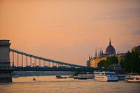avondlicht met de brug van Buda naar Pest en de kathedraal op de achtergrond in Hongarije
