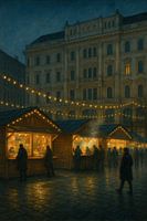 In deze sfeervolle scène baadt de kerstmarkt van Boedapest in goudkleurig licht tegen de grote gevels van de stad. Het geplaveide plein glinstert van de weerspiegelingen terwijl de lichtslingers boven je hoofd hangen. Warme stoom stroomt van de kraampjes, vermengt zich met gelach en de geur van geroosterde kastanjes. Ondanks de feestelijke energie blijft er een stilte hangen - een gevoel van vrede in de gloed.