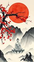 Dit sumi-e schilderij van Boeddha straalt tijdloze sereniteit uit, ingekaderd tegen de opkomende rode zon. Wilde, vloeiende penseelstreken geven de figuur een vluchtige maar krachtige aanwezigheid, alsof hij uit de mist en de inkt zelf tevoorschijn komt. De bloesems van de rode kersenbomen zweven over het tafereel, hun tere bloemblaadjes contrasteren met de gedurfde kracht van elke penseelstreek. Dit samenspel van zachtheid en kracht belichaamt de Japanse esthetiek van evenwicht - stille gratie en ongetemde vitaliteit. De compositie straalt meditatieve rust uit, waardoor het een fascinerend kunstwerk is voor ruimtes die op zoek zijn naar zowel rust als bezieling.