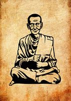 De afbeelding toont een zwart silhouet van een mediterende Boeddha-figuur tegen een getextureerde, verouderde perkamenten achtergrond. De Boeddha zit in lotushouding met zijn handen rustend op zijn schoot en straalt een gevoel van rust uit. Twee gestileerde bomen flankeren de figuur, wat bijdraagt aan de serene sfeer. Een maansikkel is zichtbaar in de rechterbovenhoek, wat duidt op een vredige nachtelijke omgeving.