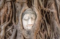 Het gezicht van Boeddha waar een boom omheen is groeit. Dit is een van de grote toeristische trekpleisters in Thailand.