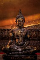 Wie ooit in Wat Pho in Bangkok is geweest kent de inmens grote en imposante liggende Boeddha natuurlijk. De kleine Boeddha op deze foto is prachtig vastgelegd met de reclining Boeddha op de achtergrond.