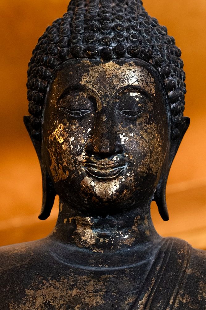 Wie ooit in Wat Pho in Bangkok is geweest kent de inmens grote en imposante liggende Boeddha natuurlijk. De kleine Boeddha op deze foto is prachtig vastgelegd met de reclining Boeddha op de achtergrond.