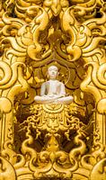 Deze boeddha in Wat Rung Khun, Chiang Rai Thailand is fraai geplaatst in een sierlijke gouden nis.