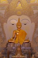 Te midden van de sublieme sfeer van Wat Suthiwararam in Bangkok staat de gouden Boeddha, een majestueuze belichaming van vrede en innerlijke harmonie. Zijn gezicht, dat wordt gekenmerkt door fijne details, gloeit in warm goud, dat met zachte elegantie samensmelt met de weerkaatsende lichtstralen in de kamer. Zijn gesloten ogen lijken de kijker uit te nodigen in een meditatieve stilte die het lawaai van de buitenwereld doet vervagen.