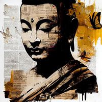 Boeddha mixed media. Prachtige afbeelding van een boeddha in gedachten verzonken, vol overpeinzingen. Afgebeeld op een tijdschrift / krant met gele oker en vlinders.
