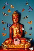 Boeddhabeeld omgeven door veel verschillende soorten vlinders. Om er een paar te noemen; Atalanta, Distelvlinder, Koninginnenpage of Papilio machaon, Dagpauwoog, Witje.