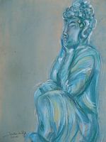 Pasteltekening van een Boeddha die ingetogen zit te mediteren. Een Boeddha is de rust zelve, ongenaakbaar voor alles om hem heen.