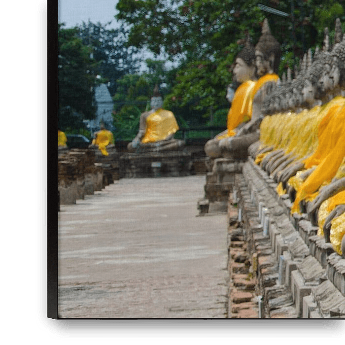 Boeddha's op een rij gekleed in een goudkleurig gewaad.