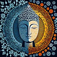 Buddha met scandinavische patronen in blauw en oranje. Bloem, blad en kaleidoscope. Prachtig voor aan de wand. Passend bij diverse stijlen en trends.