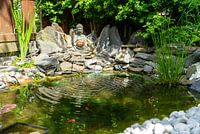 Boeddhabeeld in Japanse rotstuin met tuinvijver