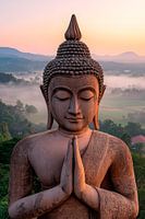 Een majestueuze Boeddha rijst op in het zachte ochtendlicht, zijn handen ineengeklemd in een vredig meditatiegebaar. Het rustige landschap op de achtergrond versterkt het gevoel van harmonie en sereniteit. Dit inspirerende kunstwerk is perfect voor de woonkamer of ontspanningsruimtes om een sfeer van contemplatie en rust te creëren.