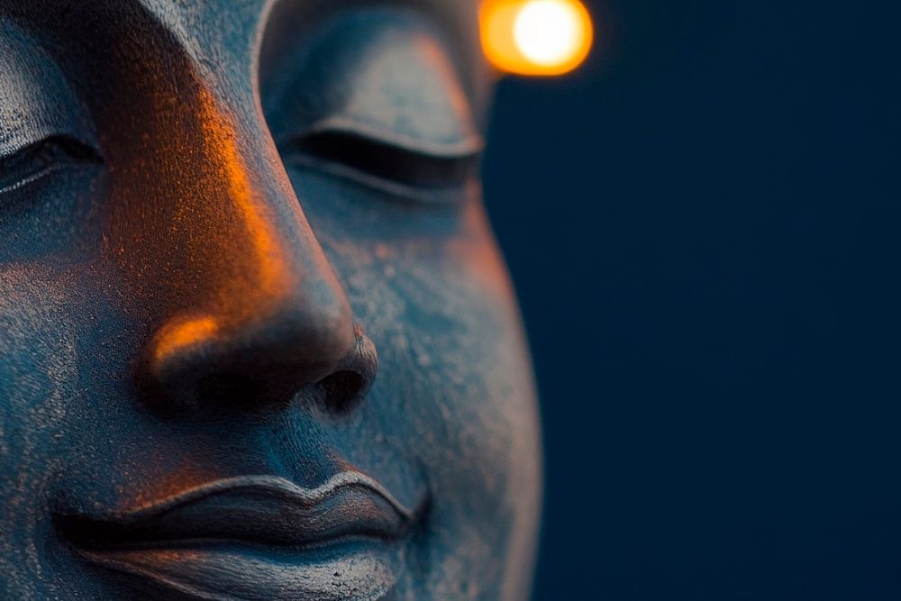 Zachte lichtstralen spelen rond een stralend gezicht, waarvan de kalme uitdrukking sereniteit en vrede uitstraalt. De delicate details en warme gloed geven de kamer een meditatieve sfeer, perfect voor een slaapkamer of gezellige woonkamer waar harmonie en ontspanning voorop staan.