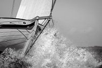 Het Ljouwerter (Leeuwarder) Skûtsje dendert door de golven op het IJsselmeer bij Stavoren tijdens een wedstrijd om het SKS Kampioensschap Skûtsjesilen 2023.