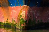 Boeg van een schip afgemeerd in de haven van Amsterdam.