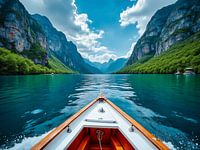 De foto toont de imposante boeg van een schip afgetekend tegen een helderblauwe hemel. De robuuste lijnen en strakke metalen vormen stralen kracht en elegantie uit. Golven spatten sierlijk op, terwijl de boeg de zee moedig doorklieft. Een beeld dat avontuur, ontdekking en de ongetemde kracht van de oceaan belichaamt.