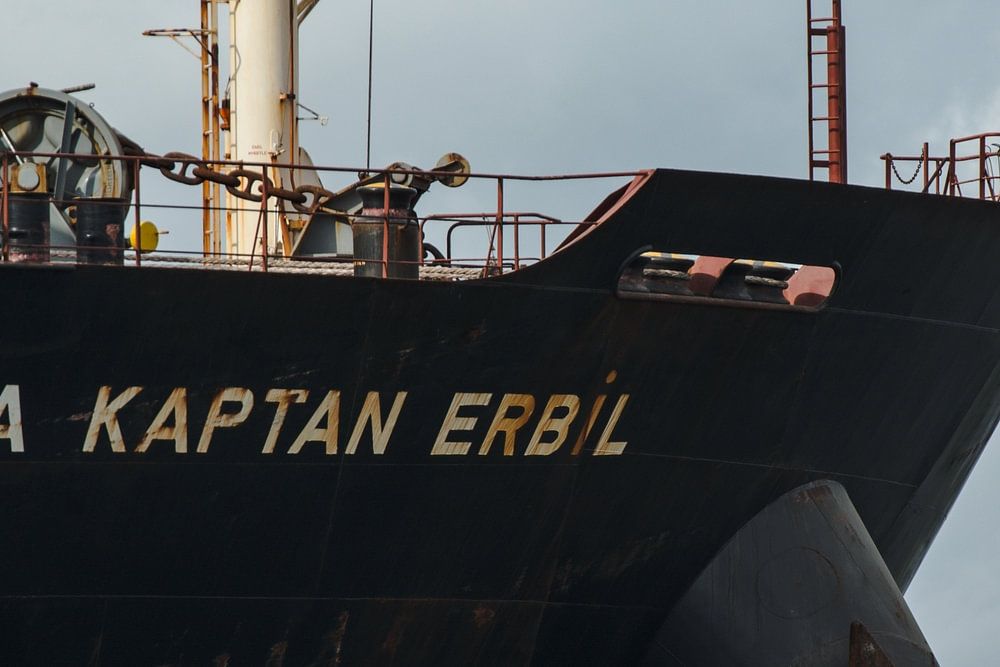 Er is een hoop op te zien op het voordek van dit zeeschip. Het ankerlier met de enorme schakels van de ankerketting in de schaduw het grote anker. De reling en de trossen naar de wal. De brandblusser en de deur naar het vooronder. De sleepsporen van de trossen of staaldraden op de boeg.