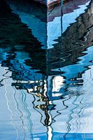 Weerspiegeling in het water van de boeg van een zeilboot met golven op het Bodenmeer Abstractie