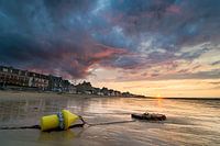 HDR foto van de Normandische kust op het strand van Saint-Aubin-sur-Mer, bij een sfeervolle en kleurrijke zonsondergang. De wolken geven hierbij extra dynamiek, terwijl de laatste zonnestralen op de statige gebouwen aan de boulevard schijnen. Op de voorgrond ligt een gele boei op het zand, wachtend op de vloed.