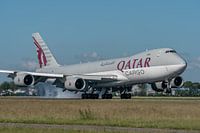Een viermotorige Boeing 747-8 Cargo van Qatar Airways is zojuist geland op de Polderbaan.