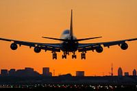 Boeing 747 landing op schiphol tijdens het eerste licht van de dag. Mooi oranje lucht met op de achtergrond de skyline van Amsterdam.