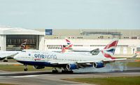 London UK British Airways Boeing 747 jumbo jet aircraft landing at London Heathrow Airport (LHR) burning the rubber off the tyres as it does so.