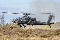 Boeing AH-64 Apache gevechtshelikopter van de Koninklijke Luchtmacht oefent op de heide bij Oirschot (GLV-5).