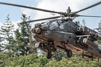 Laagvliegende Apache Boeing AH-64D gevechtshelikopter van de Koninklijke Luchtmacht boven de heide van Oirschot.